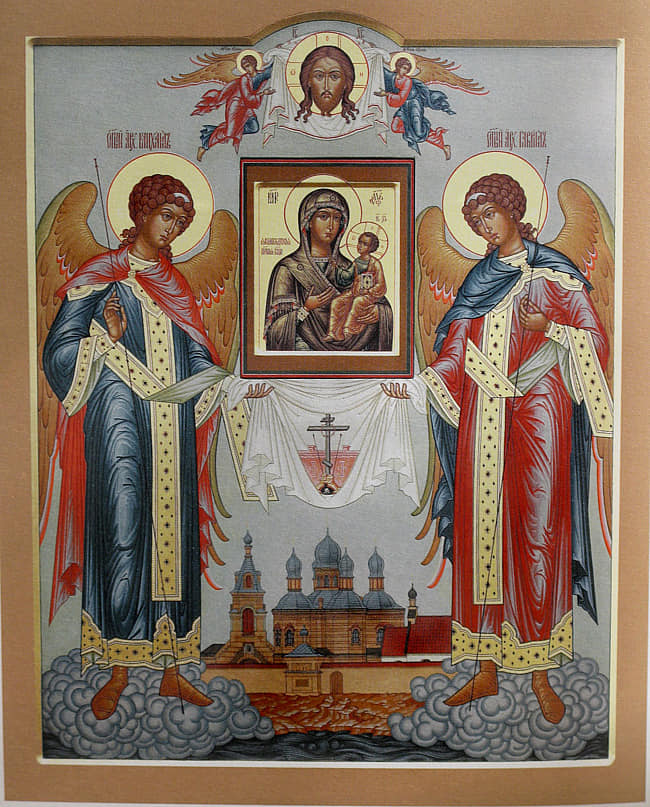 Иконография иконы необычна – небольшой по размерам (приближенный к оригиналу) образ Божией Матери с Предвечным Младенцем на руках поддерживают предстоящие архангелы Михаил иГавриил, на заднем плане изображен Свято-Духов монастырь в современном виде.