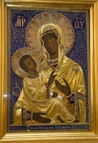 Холмская икона Божией Матери, по преданию, записанному епископом Иаковом Сушею, была написана святым евангелистом Лукойи привезена в Россию из Греции при равноапостольном князе Владимире, который после Крещения получил в дар из Константинополя много икон. Холмский образ Божией Матери изображен на кипарисовой доске. В 1261 году, во время нашествия татарских полчищ, город Холм был разграблен, икона Божией Матери также пострадала: драгоценный оклад был снят, живопись испорчена, а сама икона выброшена. Через сто лет святая икона была найдена и торжественно поставлена в Холмском соборе. На иконе остались две глубокие раны: одна на левом плече Божией Матери, другая на Ее правой руке. Сохранилось предание, что нечестивые татары, ограбившие и повредившие святой образ, были тогда же наказаны: они лишились зрения, и лица у них перекосились. Сказание о чудесных знамениях, совершившихся от иконы Божией Матери Холмской, описаны в книге архимандрита Иоанникия (Голятовского) «Новое Небо».